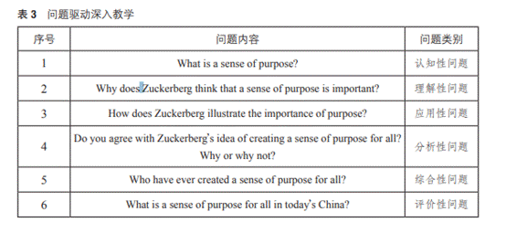 如上册第三单元课文为扎克伯格的演讲Create a Sense of Purpose for All,在进行本单元的教学设计时,笔者以问题贯穿课堂教学的始终(见表3)。