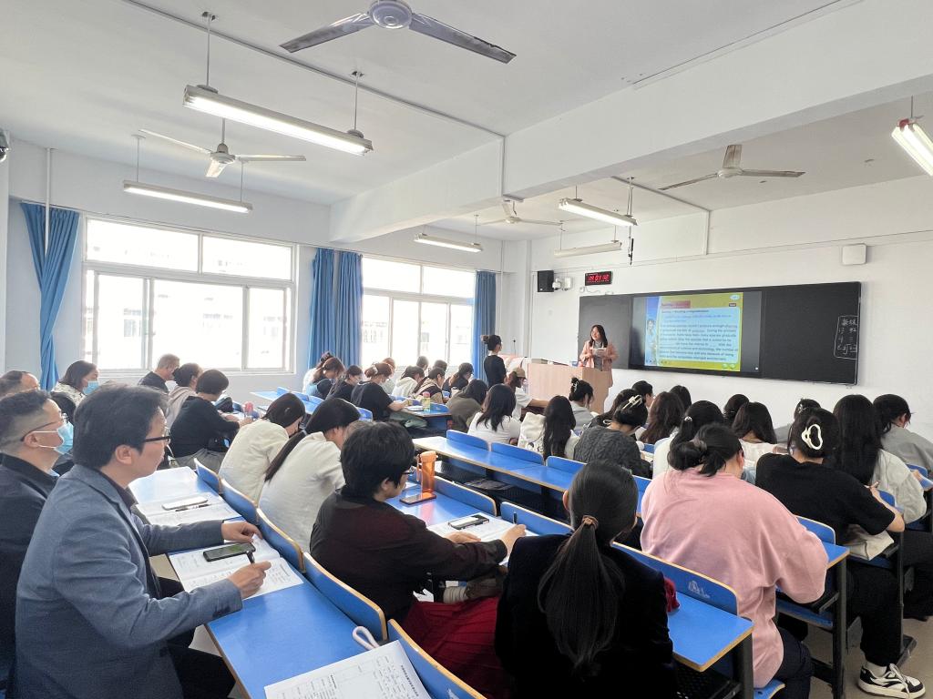 4月9日下午,公司党政领导班子成员及全体无课教师齐聚启智楼313教室,共同观摩了公司王莹老师讲授的《学前综合英语IV》课程。