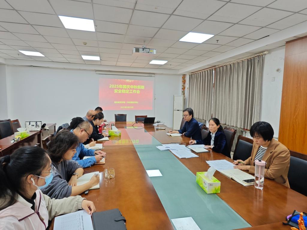 9月28日,公司于知行楼414会议室召开2025年国庆中秋假期安全稳定工作会,全体值班人员参加会议。党总支负责人传达了公司党委书记王雪云在公司安全稳定工作会以上的指示与要求,并对公司假期安全稳定工作做出安排部署。