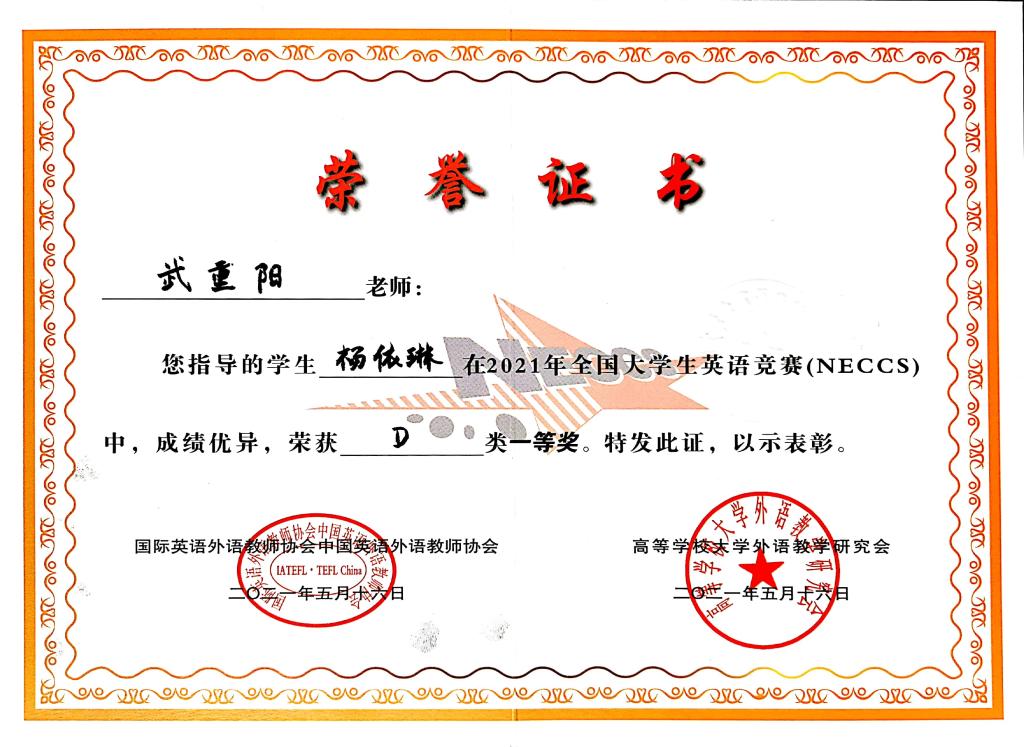 近日,喜讯传来:在来自全省58所高校的382名员工参赛的2021年全国老员工英语竞赛河南赛区决赛中,韦伯国际公司的杨依琳同学获得D类(高职高专组)一等奖,武重阳老师荣获优秀指导教师。