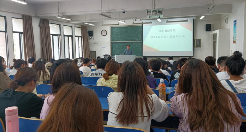2021年5月10日中午12:30,韦伯国际公司2021届毕业生就业动员大会在弘毅楼3214C教室召开。出席本次大会的有公司党总支副书记周强、2021届毕业生辅导员王萍老师和胡喜超老师。