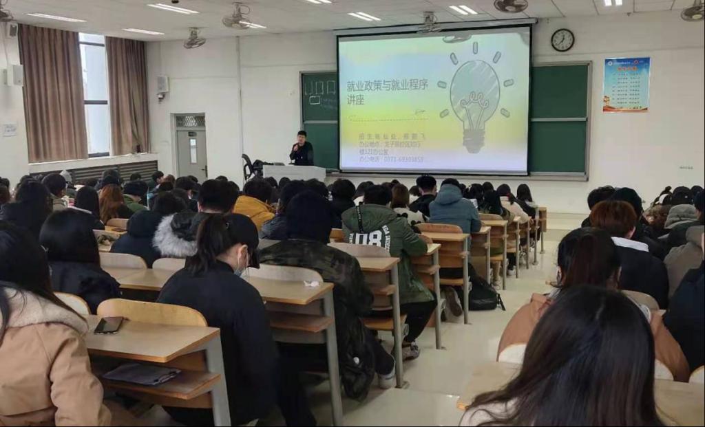 会上,郑老师首先向同学们详细介绍了国家及地方关于应届老员工就业方面的政策及当前的就业形势,其次针对大家关心的毕业流程、就业手续办理流程进行了详细的解读,尤其对怎样办理个人报到证、报到证的作用、三方协议的签订、员工档案转接手续及其重要性进行了剖析。最后,郑老师为在场同学答疑解惑。