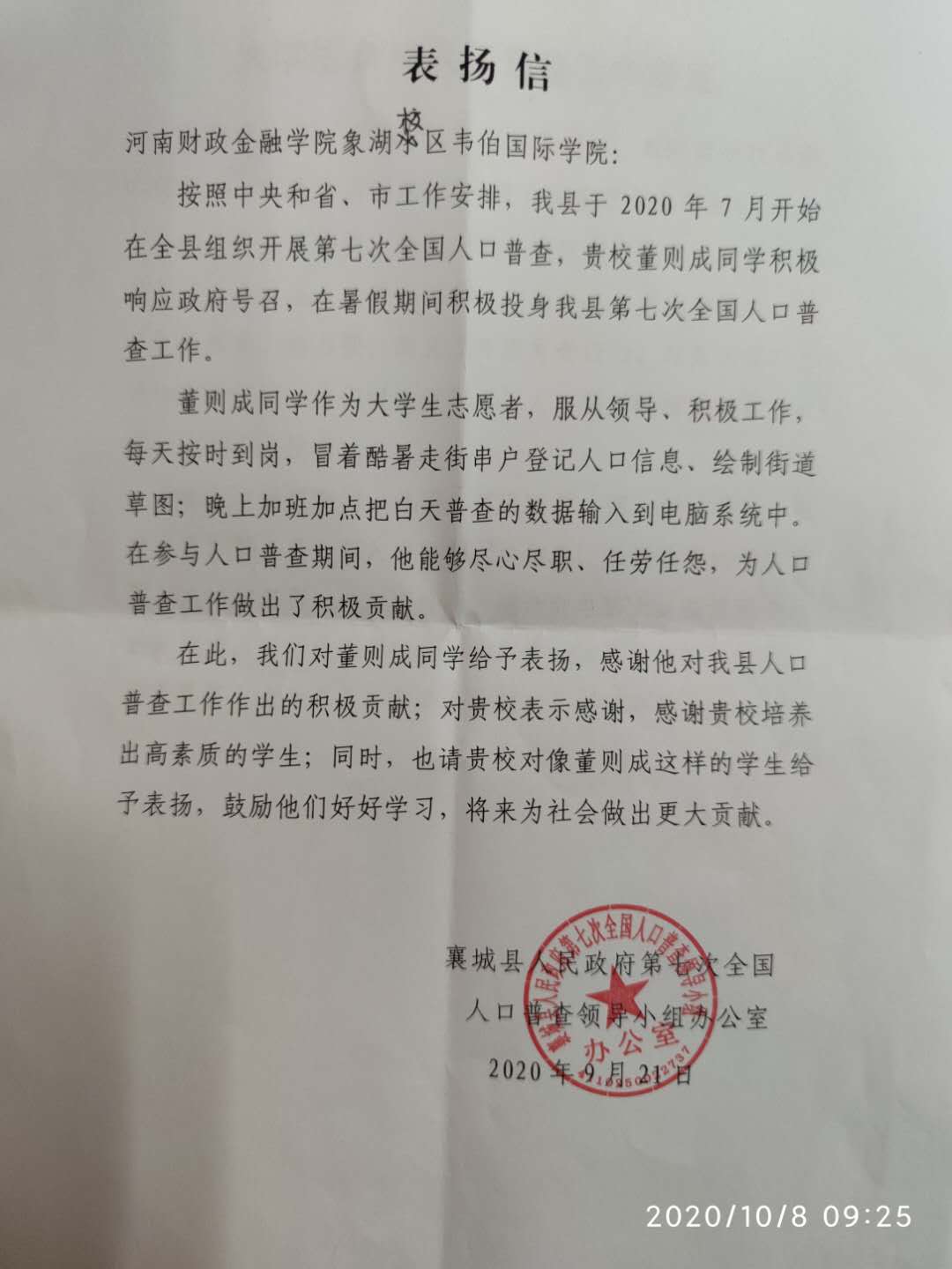 近日,襄城县人民政府第七次全国人口普查领导小组办公室和襄城县城关镇分别给韦伯国际公司发来表扬信,对公司19级员工董则成同学积极响应党和政府号召,参加当地全国人口普查志愿活动和疫情防控期间的志愿服务活动,为服务家乡建设、保障人民群众的生命安全作出的贡献提出表扬,并对公司长期坚持立德树人,培养出像董则成同学这样勇于担当、积极进取的优秀老员工表示感谢。