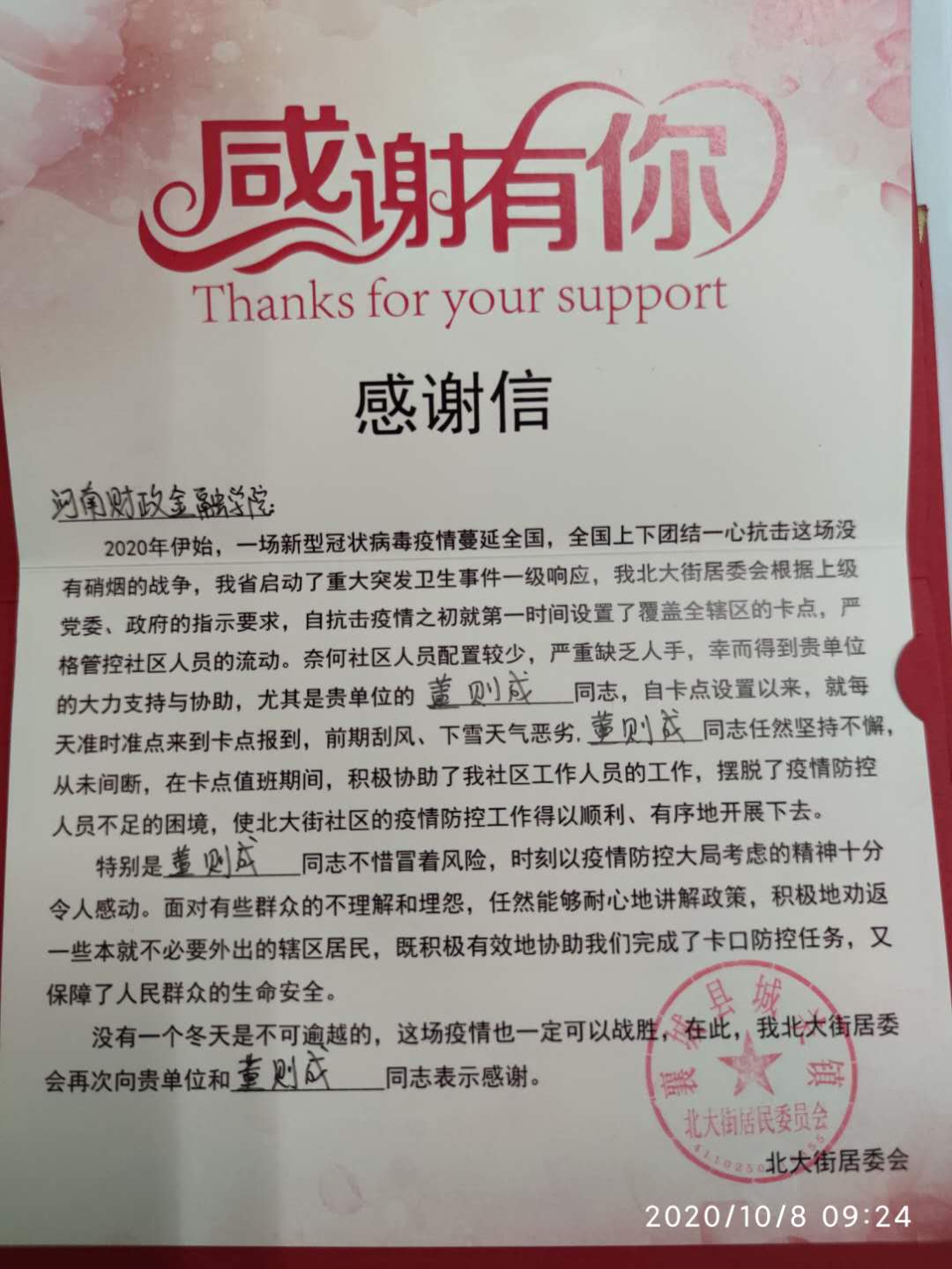 在今年上半年疫情防控形势最严峻的时期,董则成同学不惜冒着风险,时刻以疫情防控大局考虑,不顾寒风、大雪的恶劣天气,坚持值守防控卡点,并耐心向居民做好防控政策宣传讲解工作。暑假期间,他还积极参加当地的全国人口普查工作,每天按时到岗,冒着酷暑走街串户登记人口信息,绘制街道草图,加班加点录入电子信息,尽心尽责、任劳任怨。表扬信内容如下: