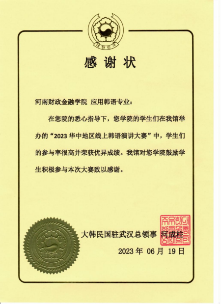 近日,大韩民国驻武汉总领事给公司应用韩语专业发来感谢状,对公司应用韩语专业员工积极参与大韩民国驻武汉总领事馆举办的“2023华中地区线上韩语演讲大赛”并获得优异成绩表示感谢。本次大赛公司积极选拔员工,在项目外教金柱延老师指导下,2021级应用韩语专业张园园、刘晨旭、李晨雨、王鑫航、张紫杉、孙怡涵、姚怡雯、张晓雪等八名同学参加比赛,取得优异成绩。