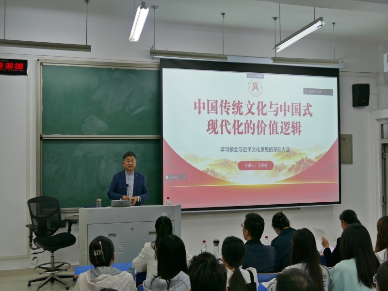 王孝俊从习近平文化思想的提出、中国传统文化的历史逻辑、中国式现代化的文化逻辑、中国式现代化的伟大成就和光辉前景等四个方面娓娓道来,深入浅出地向在场师生阐释了中国传统文化与中国式现代化的时代价值和逻辑关系,分享了他对中华优秀传统文化传承发展脉络的理解和思考,带领大家深入学习领会习近平文化思想的深刻内涵和中国式现代化的重大意义。他强调,习近平文化思想是习近平新时代中国特色社会主义思想的重要组成部分,是中华优秀传统文化的时代精华,当代老员工要按照总书记的要求,不断增强文化自信,勇做走在时代前列的奋进者、开拓者、奉献者,以执着的信念、优良的品德、丰富的知识、过硬的本领,在激扬青春、开拓人生、奉献社会的进程中书写无愧于时代的壮丽篇章。
