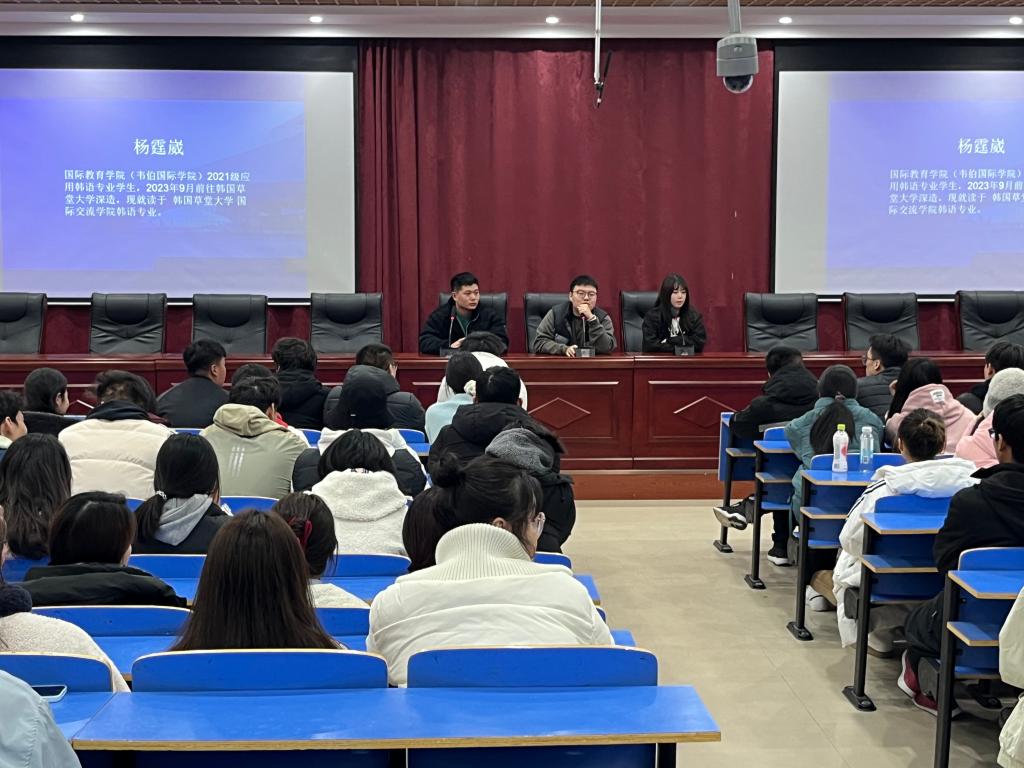 英国上市公司365应用韩语项目2013年开始招生。经过10多年的发展,招生规模不断扩大,出国留学的员工也不断增多。为了更好地进行项目宣传,让更多的员工了解出国学习的实际情况,公司特邀请2019级王子铭同学和2021级杨霆崴、李恬静同学给全院员工做留学经验交流。