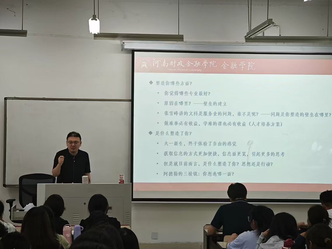 9月29日上午,金融公司金融学教研室主任王瑛龙博士在象湖校区弘文楼1102教室里为公司金融服务与管理专业新生们进行了专业教育。王博士从“大家为什么选择这个公司、这个专业”这个问题入手,给同学们阐明了目标的重要性。他强调在大学期间要培养核心竞争力,并给出了一些具体的人生建议,如:确定目标、交好朋友、培养爱好、多读好书、学会表达、锻炼身体等。随后,王博士又从金融服务的本质出发,详细讲解了金融服务与管理专业的核心课程和实践环节,指出金融服务与管理专业旨在培养具备金融理论知识、熟悉金融业务操作、具备良好沟通能力和创新精神的复合型人才。